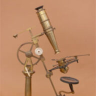 This Drum Microscope (Oberhaeuser #1956) has a lead-filled base with a substage cutout to reveal the planoconcave illumination mirror. A spring-loaded focusing mechanism is contained within the support shaft and is actuated by a knurled knob beneith the shaft. The optics consist of three eyepieces, two nosepieces, and two objective lenses. The low magnification lens is a single plano-convex lens. The other nosepiece has an objective of three stacked lenses. There is a Bull’s Eye lens (planoconvex) for illuminating opaque samples. The microscope body tube has no field lens, however it telescopes to allow for different focal length objective lenses and the three eyepieces. Specimens are held onto the stage with spring clips. This microscope comes with several, labeled glass slides and a mahogany storage case. The case also is stamped with the serial number “1956”. This serial number dates the manufacture of the instrument precisely to 1849/50*. Imaging is good with a maximum magnification of approximately 125x. The microscope is 23cm tall.